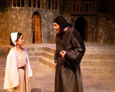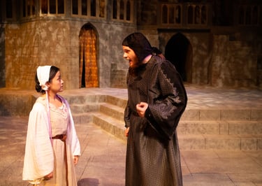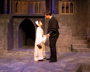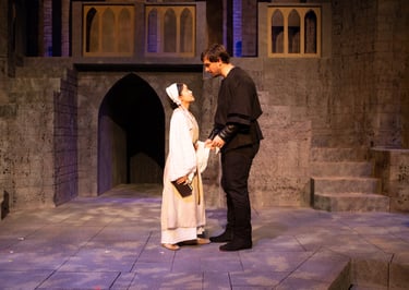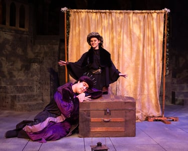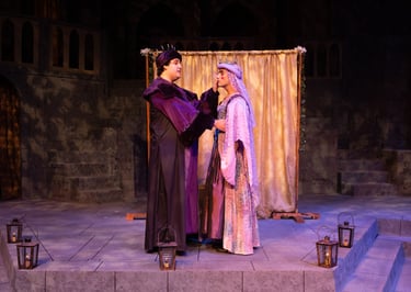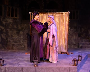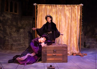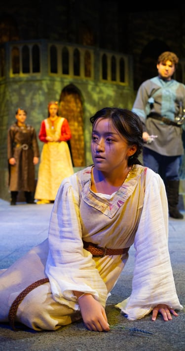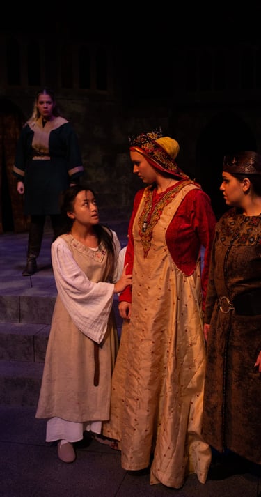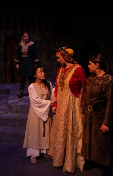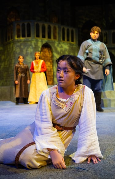 For this production, I was given the job of coaching Hannah Nguyen (pictured as Ophelia in the beige dress below) and blocking all of the Ophelia scenes. I also blocked the Players' play within a play (pictured top 3rd picture and bottom 2nd picture) and ran the intimacy calls before rehearsals.
