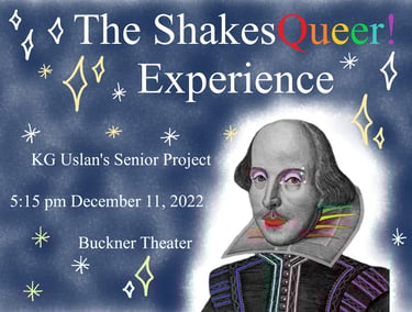 For my Senior Theatre Capstone, I collected ten of Shakespeare's most popular monologues from ten of his plays and then placed them into a queer context. I adapted each piece to fit a different identity or experience within the LGBTQ+ identity. I strived to create an emotional through line starting with coming out of the closet and ending with experiencing queer joy. I directed this project, primarily coaching each actor one on one.