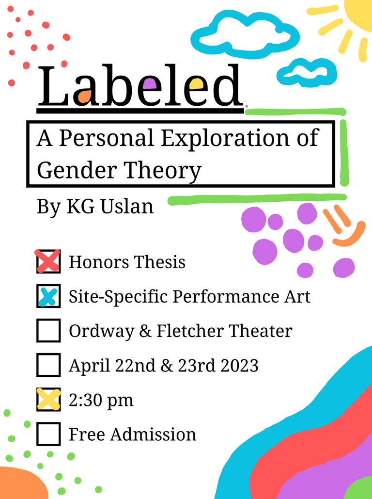 The ideas surrounding gender differ widely across various spheres of life. Within academia, binary operations, and how they are present in our construction and view of gender, are often discussed. Within daily life, gender is a controversial subject with trans and gender non-conforming people being attacked for living their authentic experience. Within theatre, there is also a lack of representation of these groups. To help bridge the gap between theory, praxis, and theatre, I created an original performance piece that was put on in a non-traditional theatre space on the FSC campus. The piece follows Gio as they struggle with the different facets of being non-binary on both a personal and theoretical level. I grounded my piece in gender theory by Judith Butler and Michel Foucault and trans theory by Susan Stryker. I was also inspired by feminist and queer theatre. I explored the embodied experience of gender in a way accessible to a broader audience.